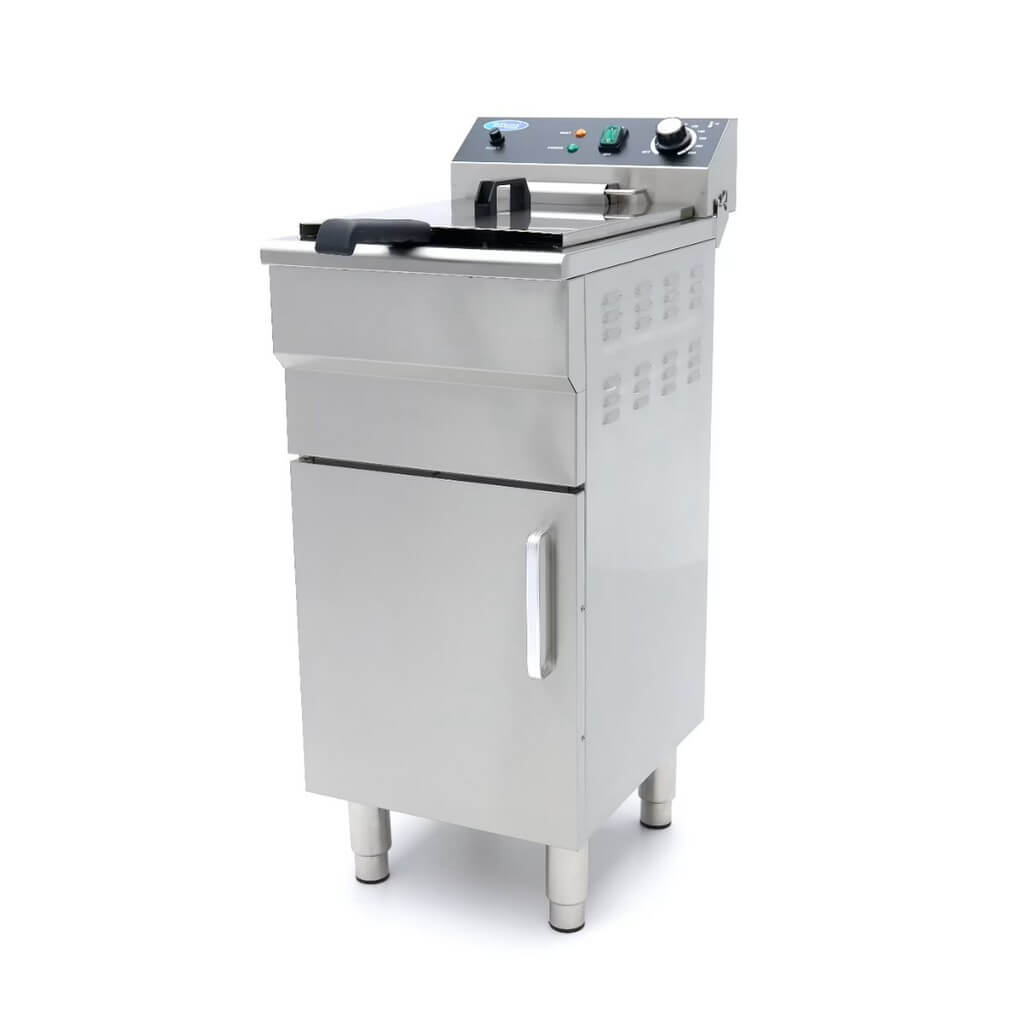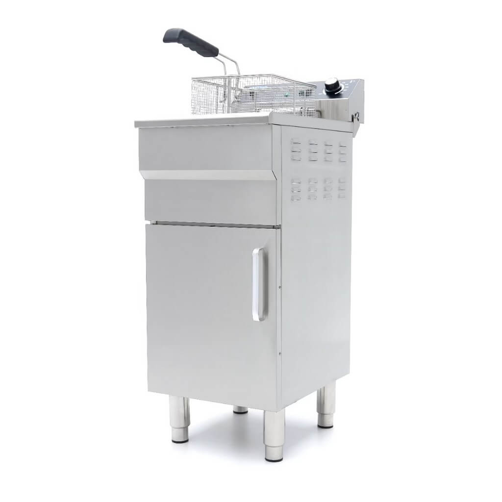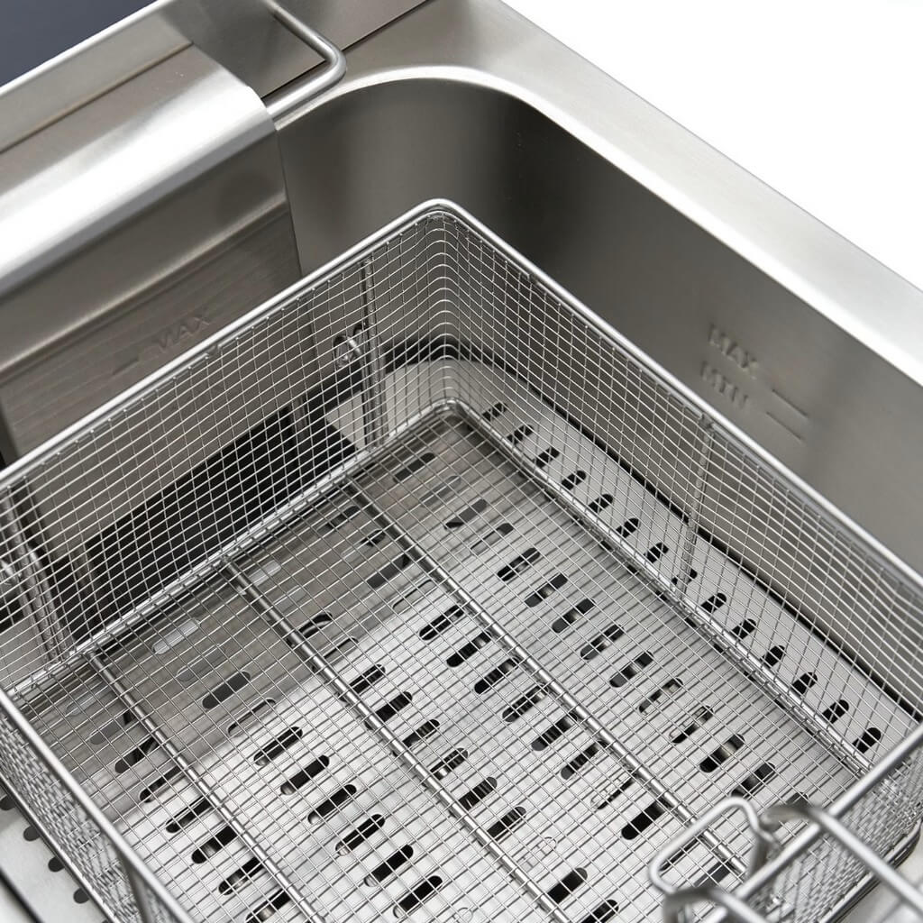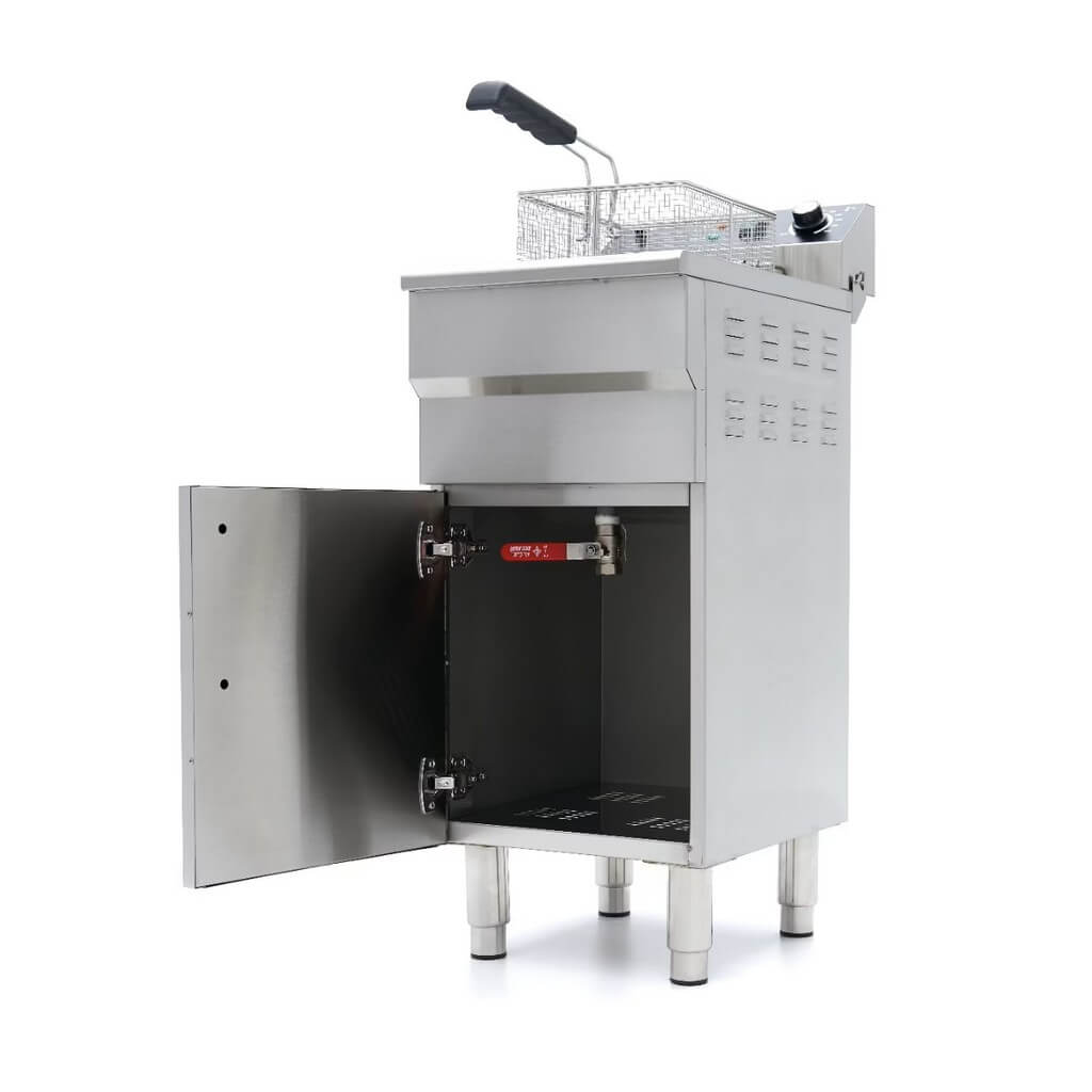 Ova friteza se izdvaja od većine velikih modela jer radi na 230V, eliminišući potrebu za dodatnim napajanjem. Napravljena od izdržljivog nerđajućeg čelika, ima praktičnu bazu za skladištenje predmeta kao što su kanisteri sa uljem za prženje. Na dnu se nalazi slavina za ispuštanje opremljena filterom koja omogućava lako i efikasno uklanjanje starog ulja, a istovremeno osigurava da se mrvice i ostaci ne ispuštaju sa njim. Pored toga, friteza ima hladnu zonu kako bi se sprečilo sagorevanje čestica hrane, održavajući kvalitet ulja za prženje. Opremljena je korpom za prženje od nerđajućeg čelika, sigurnim poklopcem, zaštitom od pregrevanja i sigurnosnim prekidačem koji se nalazi ispod grejnog elementa.
