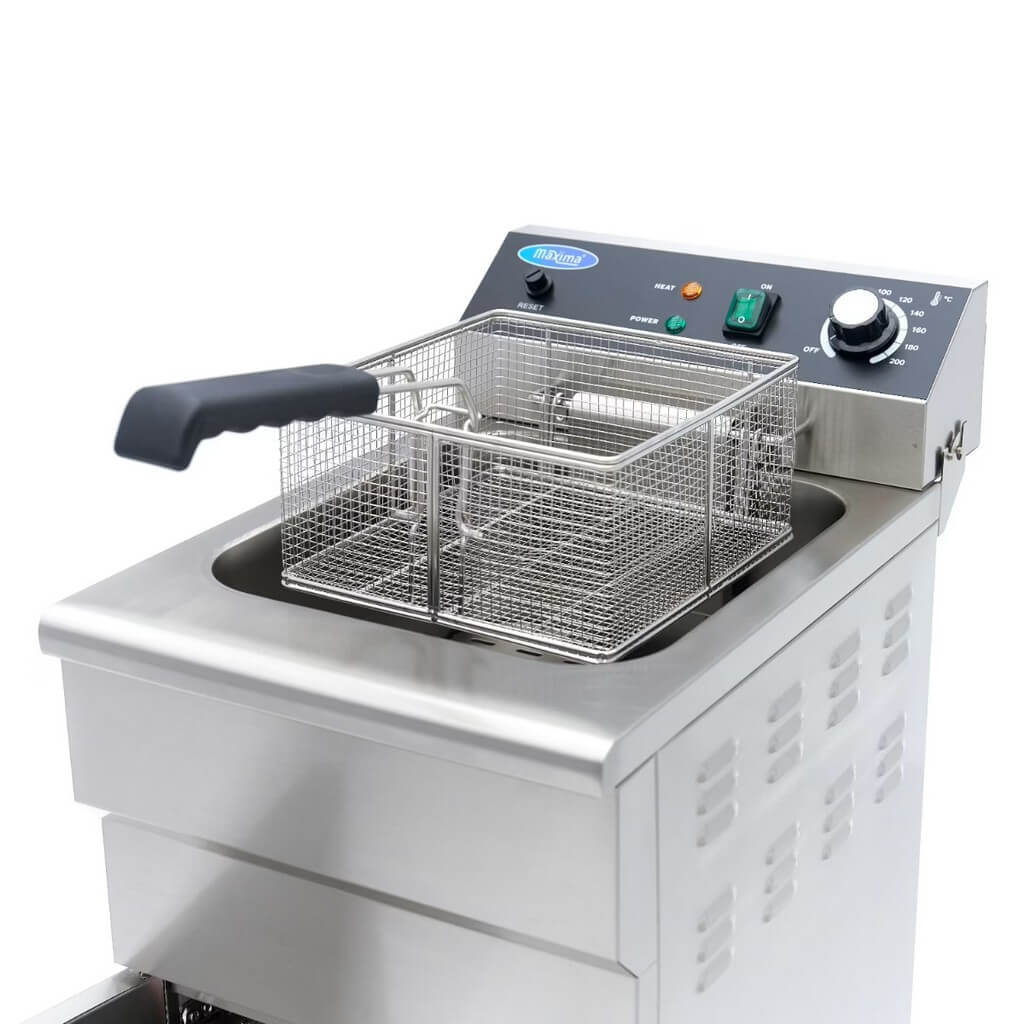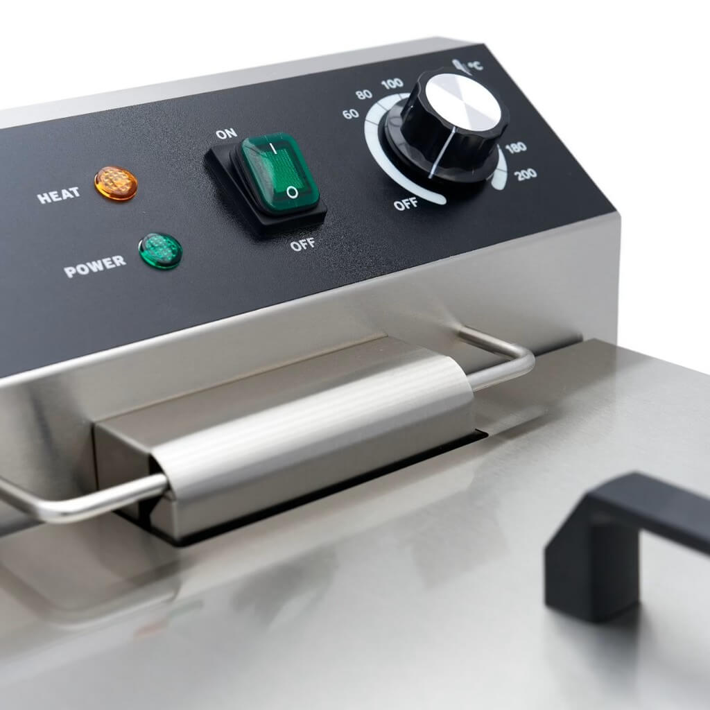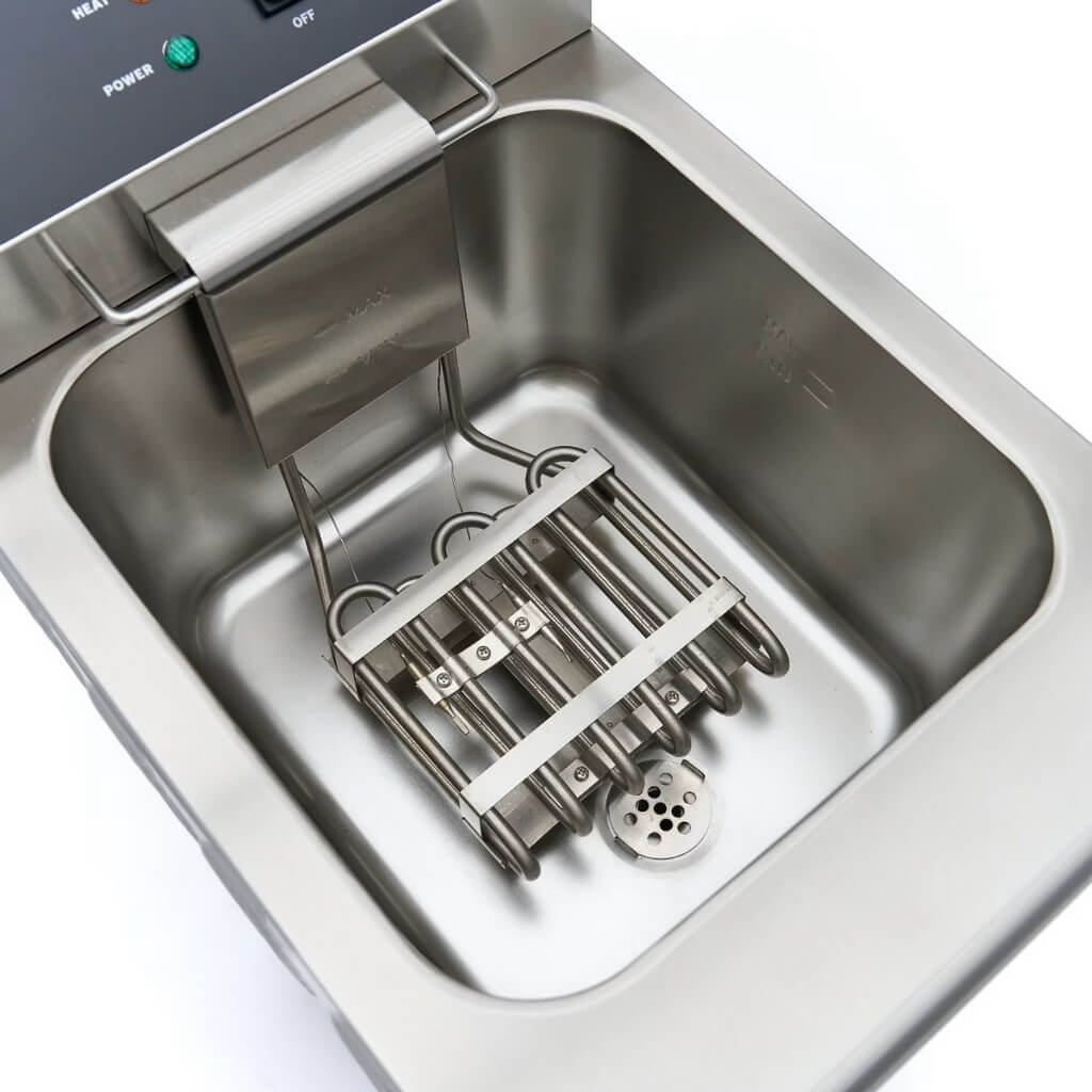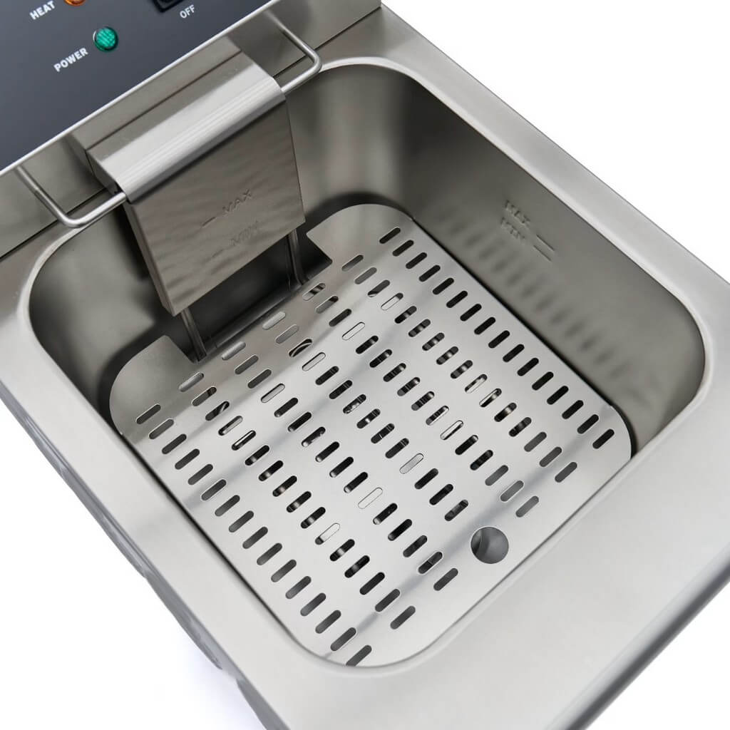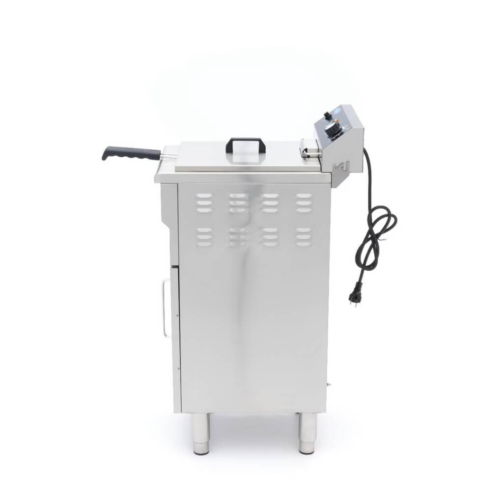 Ova friteza se izdvaja od većine velikih modela jer radi na 230V, eliminišući potrebu za dodatnim napajanjem. Napravljena od izdržljivog nerđajućeg čelika, ima praktičnu bazu za skladištenje predmeta kao što su kanisteri sa uljem za prženje. Na dnu se nalazi slavina za ispuštanje opremljena filterom koja omogućava lako i efikasno uklanjanje starog ulja, a istovremeno osigurava da se mrvice i ostaci ne ispuštaju sa njim. Pored toga, friteza ima hladnu zonu kako bi se sprečilo sagorevanje čestica hrane, održavajući kvalitet ulja za prženje. Opremljena je korpom za prženje od nerđajućeg čelika, sigurnim poklopcem, zaštitom od pregrevanja i sigurnosnim prekidačem koji se nalazi ispod grejnog elementa.