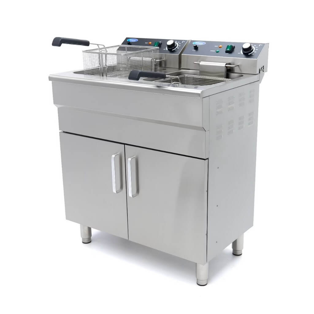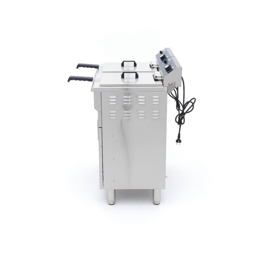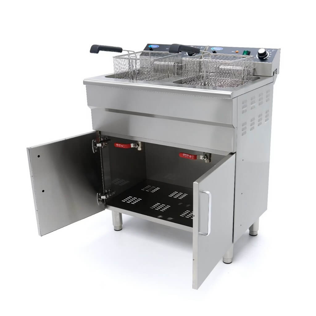 Za razliku od mnogih velikih friteza, ovom modelu nije potrebno posebno napajanje. Svaka jedinica ima svoj utikač, što obezbeđuje energetsku efikasnost, jer se struja koristi samo kada je friteza uključena. Dvostruka friteza ima prostran ormar za odlaganje sa dvoja vrata, savršen za praktično skladištenje zaliha poput ulja za prženje. Dizajn ove friteze pruža udobnu radnu visinu za lako prženje. Svaka friteza je takođe opremljena slavinom za ispuštanje ispod rezervoara za ulje, što pojednostavljuje odlaganje ulja. Ugrađeni filter na slavini osigurava da se mrvice hvataju, pomažući da ulje duže ostane čisto. Pored toga, obe friteze imaju hladnu zonu kako bi se sprečilo sagorevanje ostataka hrane, produžavajući vek trajanja ulja za prženje. Standardne karakteristike uključuju korpe za prženje od nerđajućeg čelika, zaštitu poklopaca od pregrevanja i sigurnosni prekidač koji se nalazi ispod grejnog elementa.