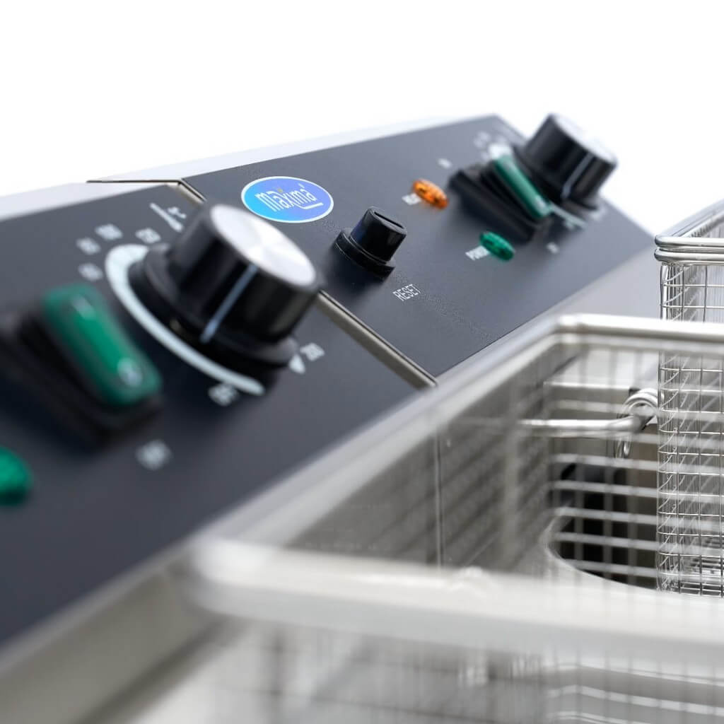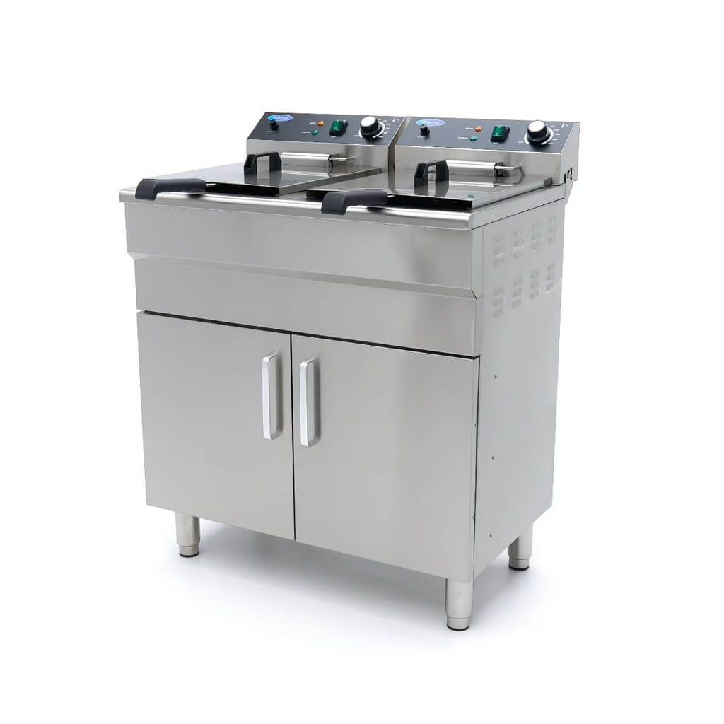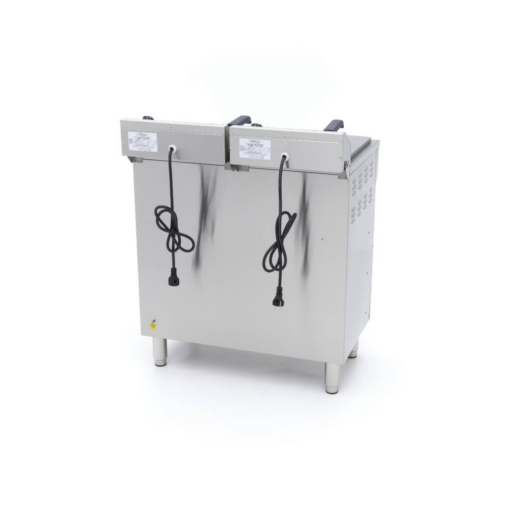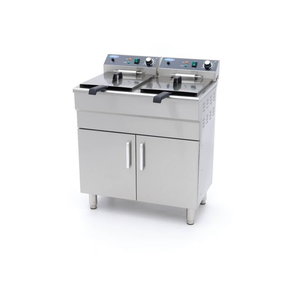 Za razliku od mnogih velikih friteza, ovom modelu nije potrebno posebno napajanje. Svaka jedinica ima svoj utikač, što obezbeđuje energetsku efikasnost, jer se struja koristi samo kada je friteza uključena. Dvostruka friteza ima prostran ormar za odlaganje sa dvoja vrata, savršen za praktično skladištenje zaliha poput ulja za prženje. Dizajn ove friteze pruža udobnu radnu visinu za lako prženje. Svaka friteza je takođe opremljena slavinom za ispuštanje ispod rezervoara za ulje, što pojednostavljuje odlaganje ulja. Ugrađeni filter na slavini osigurava da se mrvice hvataju, pomažući da ulje duže ostane čisto. Pored toga, obe friteze imaju hladnu zonu kako bi se sprečilo sagorevanje ostataka hrane, produžavajući vek trajanja ulja za prženje. Standardne karakteristike uključuju korpe za prženje od nerđajućeg čelika, zaštitu poklopaca od pregrevanja i sigurnosni prekidač koji se nalazi ispod grejnog elementa.