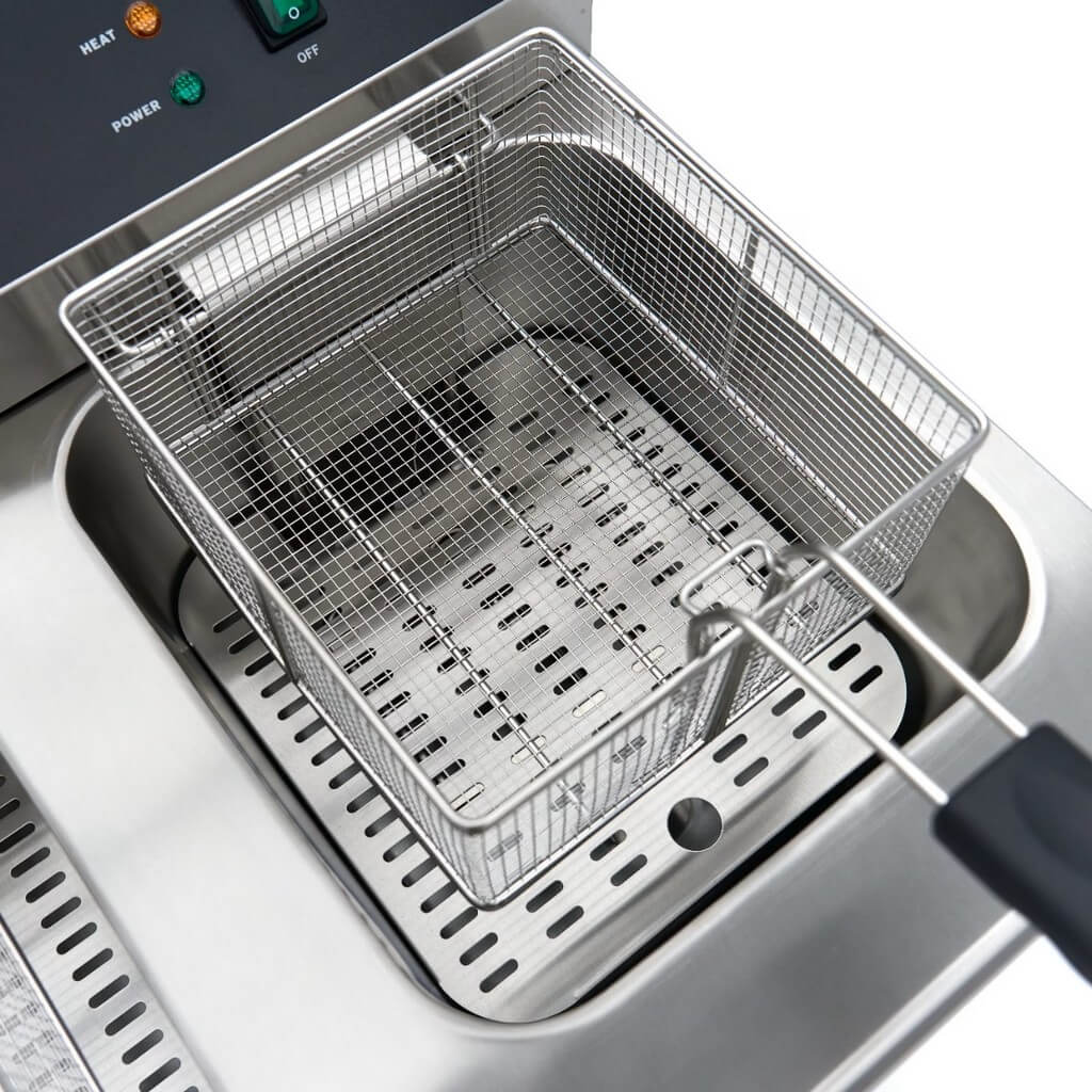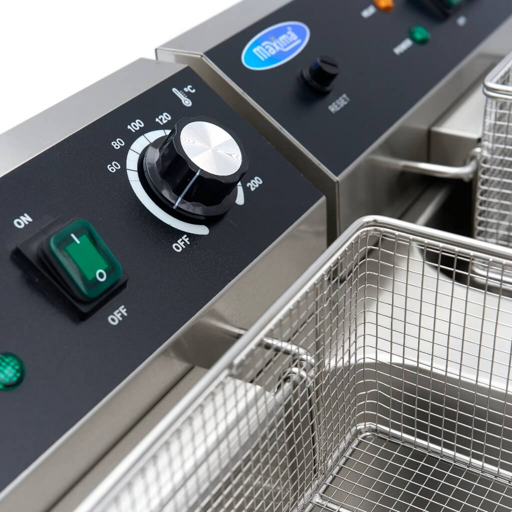 Ova robusna dvostruka friteza radi na 230 volti i ima dva standardna utikača, što je čini svestranom i idealnom za kuhinje i prodavnice brze hrane. Svaka friteza ima veliki kapacitet ulja do 13 litara, što vam omogućava da lako pripremite velike količine pomfrita.