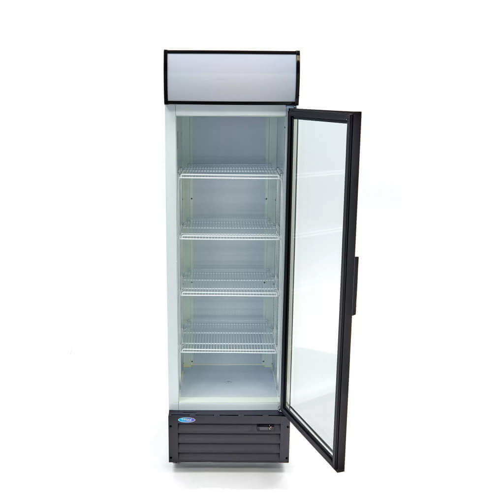 Ovaj profesionalni frižider firme Maxima, kapaciteta 360l, idealan je za prezentaciju i čuvanje raznih veličina flaša, limenki, pa čak i grickalica. Zahvaljujući vratima sa duplim staklom i ugrađenom LED osvetljenju, gosti mogu odmah da vide proizvode koje imate u ponudi. Za atraktivnu promociju proizvoda možete koristiti i reklamni panel na vrhu frižidera, koji dolazi sa pozadinskim osvetljenjem. U unutrašnjosti se nalaze četiri police od nerđajućeg čelika koje se mogu podesiti prema vašim željama. Vrata su opremljena bravom i dva ključa.