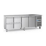 Gume na vratima se zagrevaju kako bi se sprečilo smrzavanje. Vrata se zatvaraju pomoću magnetne zaptivke koja sprečava da slučajno ostanu otvorena. Sa dužinom od 223cm, ovaj plusni hladni sto je veoma velik, ali se lako pomera zahvaljujući točkovima. Prednji točkovi imaju kočnicu, što vam omogućava da zadržite frižider na jednom mestu. Radna ploča je idealna za pripremu ukusnih jela – svi vaši sastojci su na dohvat ruke.